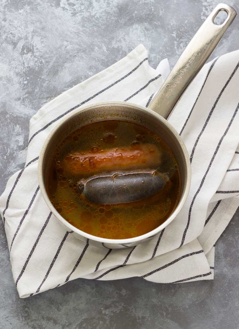 - Para hacerlo introducimos en un cazo con agua la morcilla y el chorizo y cocemos durante 20 minutos.