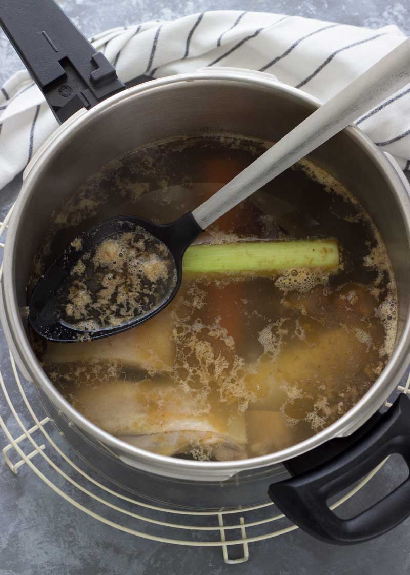- Veremos que en la olla se empieza a formar una especie de espuma, que son impurezas y grasa de la carne, por lo que con cuidado vamos retirando con una cuchara hasta quitar toda la que podamos.
