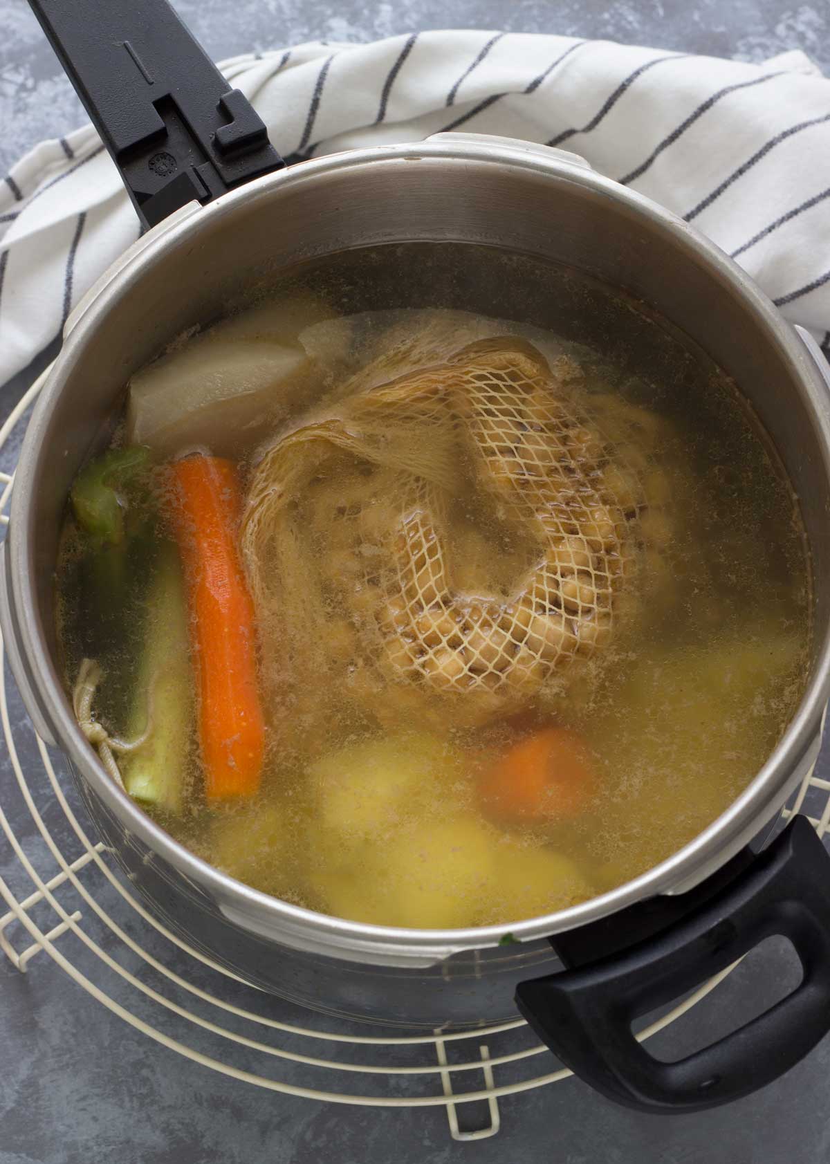 - Otra cosa a la que me he acostumbrado es a meterlos en una malla para garbanzos como esta ya que me facilita mucho el volcado de los diferentes ingredientes. De esta forma para retirar la carne una vez cocinada tan solo tengo que sacar la malla de garbanzos. Si estoy haciendo cocido los separo ya a una fuente aparte y, en el caso del puchero los vuelco con la sopa una vez retirada la carne.