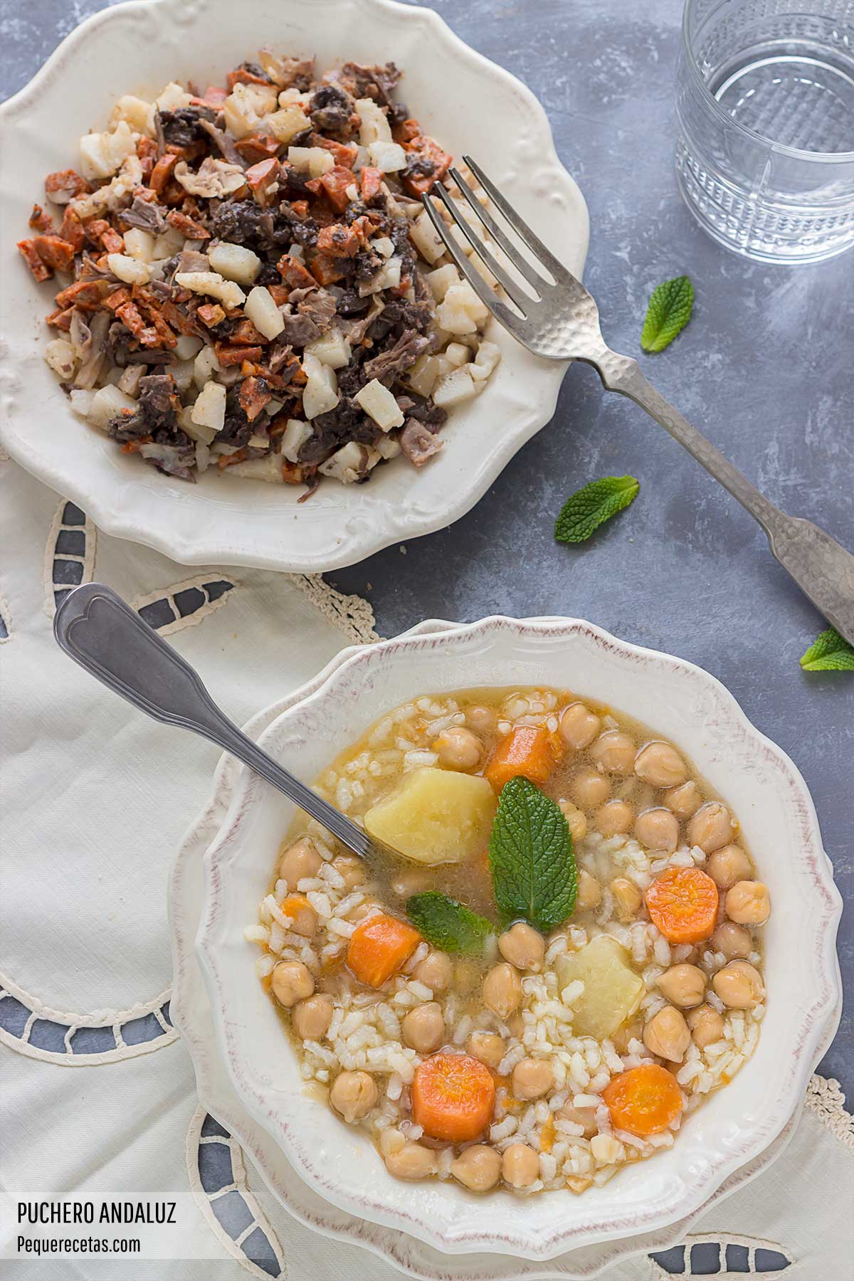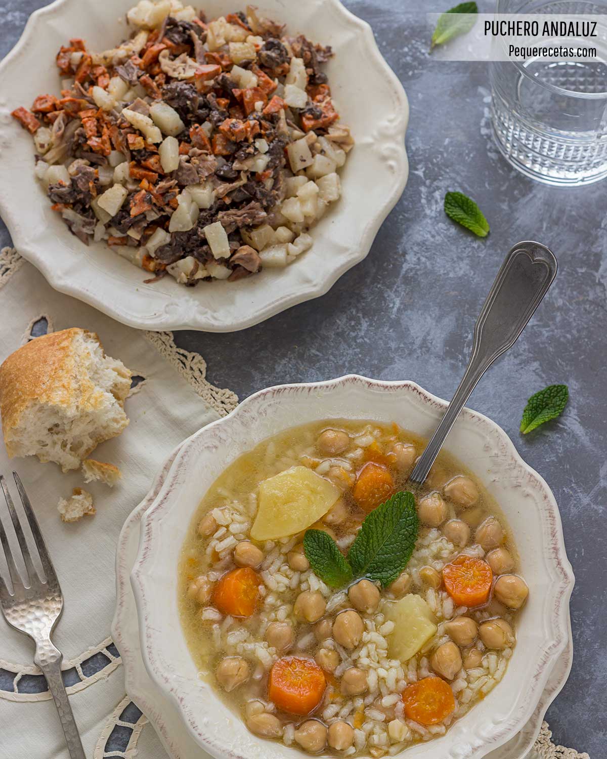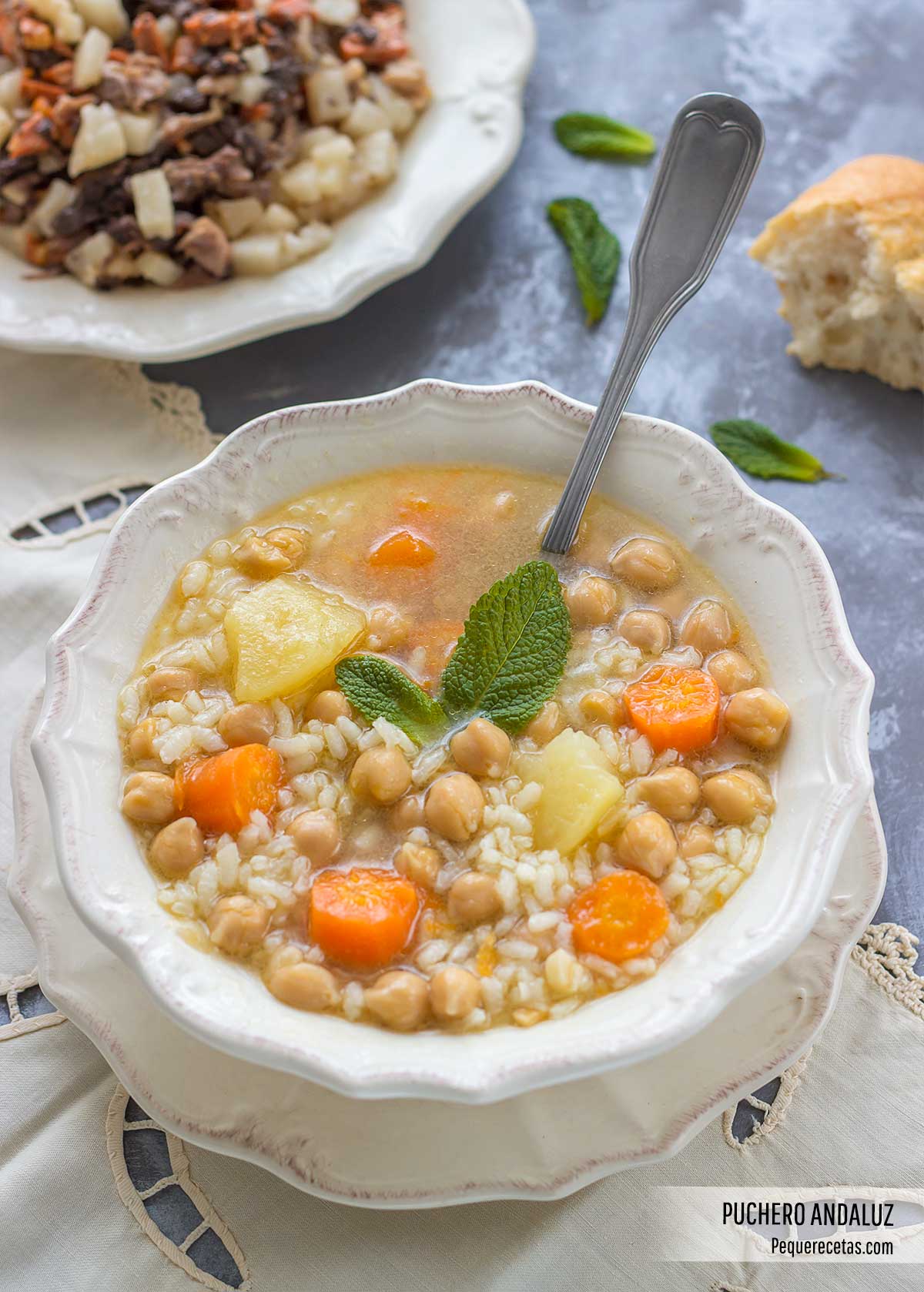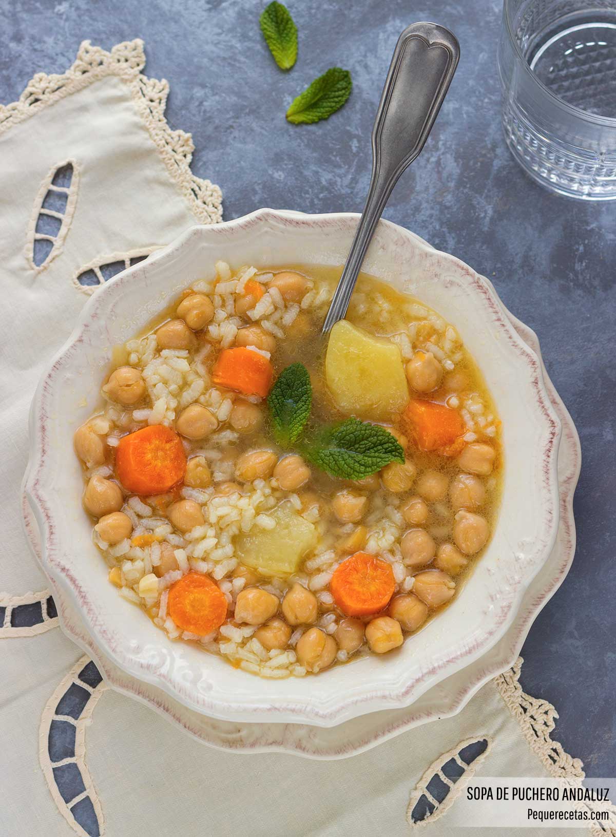 Otros elementos como la forma de presentación de la sopa de puchero, en la que se introducen los garbanzos, y que puede ir con fideos o arroz, y el toque de hierbabuena, imprescindible en esta sopa, hacen que este cocido andaluz tenga nombre propio.