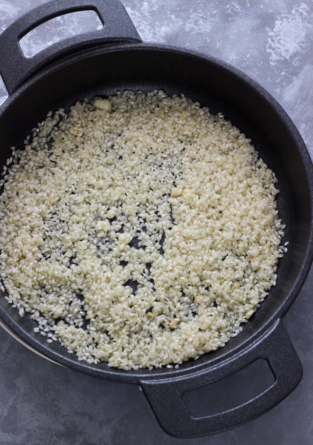 - Luego echamos el arroz, y lo movemos bien para que coja el sabor del ajo.