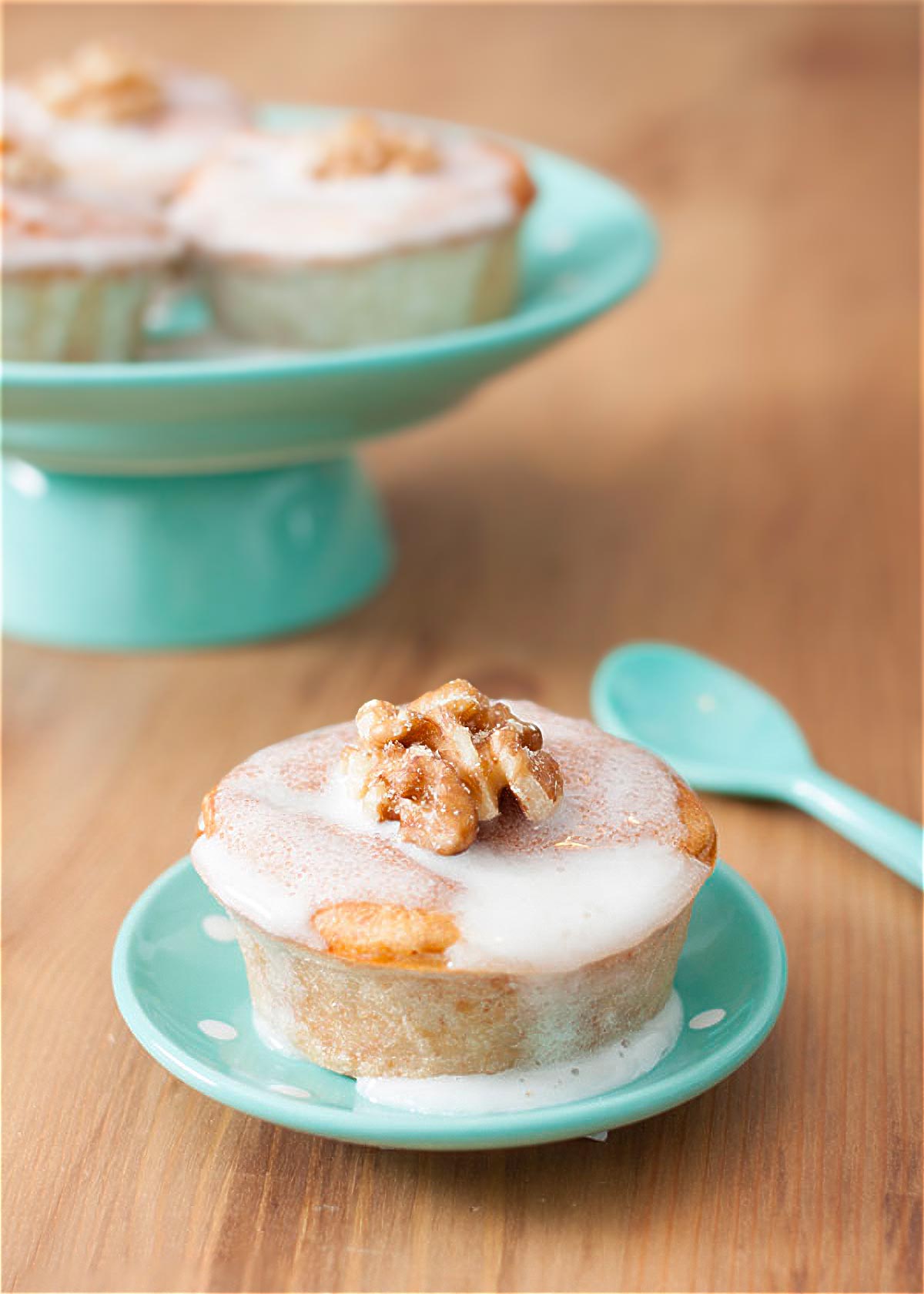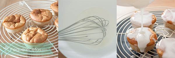 - Ponemos los budines encima de una rejilla y echamos por encima el glaseado, dejando que caiga de de madera natural para cubrirlo. Si os gusta un glaseado más firme, utilizad un poco menos de agua.