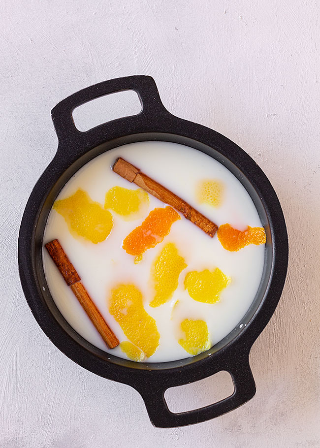 - En un cazo ponemos la leche con la rama de canela, la cucharadita de esencia de vainilla, y la ralladura de limón y naranja.