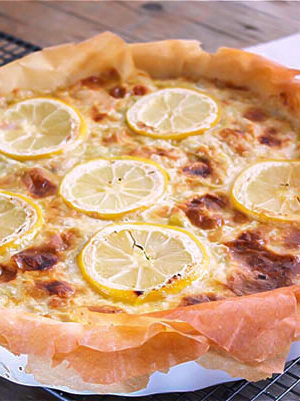 Este pastel de puerros y gambas está más que delicioso. Se prepara con masa filo y su textura crujiente y relleno son irresistibles: