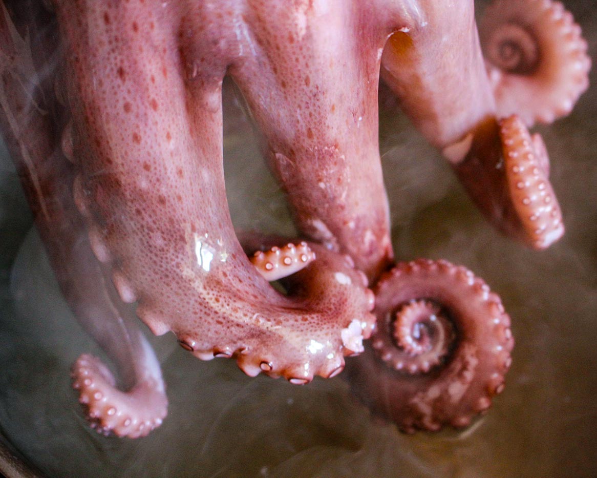 - Cuando comience a hervir, cogemos el pulpo por la cabeza e introducimos las patas unos segundos, sacamos y repetimos la operación tres o cuatro veces. Hemos «asustado» al pulpo para que no se le desprenda la piel durante la cocción.