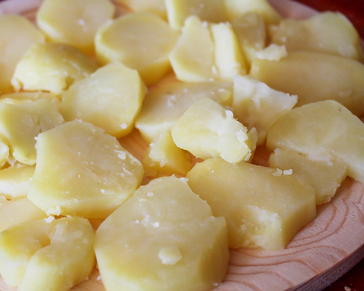 - Ponemos a hervir agua en otra cazuela, esta vez con sal, para cocer las patatas con piel.