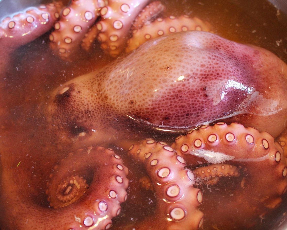Para que la piel no se desprenda se dice que hay que asustarlo tres veces, es decir, se meten las patas unos segundos en el agua hirviendo, se sacan y se vuelven a meter: notaréis como las patas se rizan, aunque parece que esto se consigue dejando el pulpo un rato más en el agua caliente.
