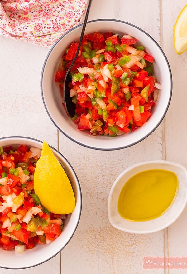 Preparación: cortamos el tomate, el pimiento y la cebolla en cubitos pequeños y picamos el manojo de cilantro. En un bol mezclamos todo, añadimos el zumo de la lima o el limón, la sal y la pimienta y un chorro de aceite y removemos.