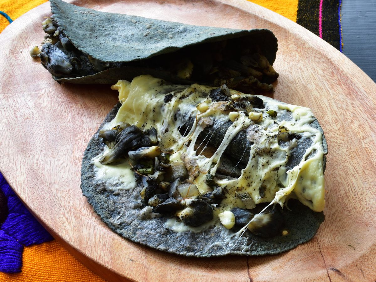 Ingredientes: 4 tortillas; 200 g de champiñones; media cebolla; 1 diente de ajo; 125 g de huitlacoche; 120 g de queso cheddar; 120 g de queso mozzarella; aceite de oliva virgen extra; sal; pimienta.