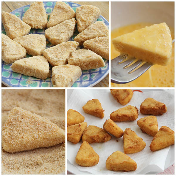 - Pasamos los quesitos por pan rallado, después por huevo batido y de nuevo por pan rallado.
