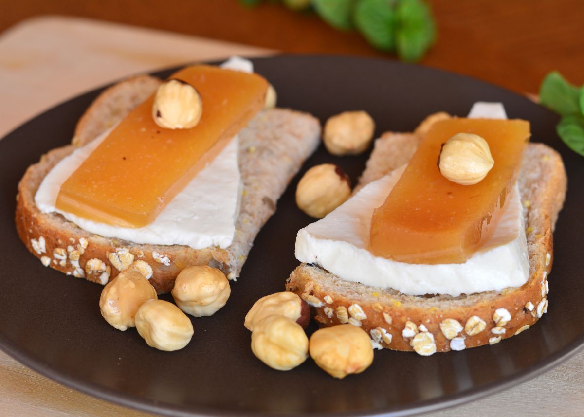 tostadas de queso fresco con membrillo y avellanas