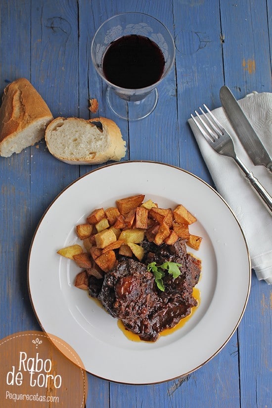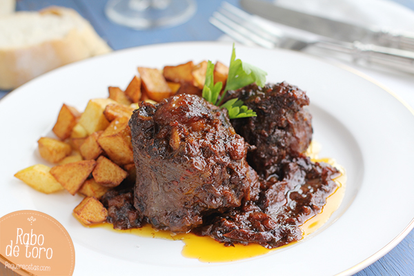 Este rabo de toro en salsa se puede servir con puré de patatas, aunque la mejor guarnición del rabo de toro son unas patatas cortadas a cubos y fritas. Acompaña la carne con la salsa que habrá quedado reducida, y te aseguro que necesitarás pan para mojar.