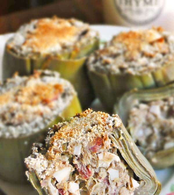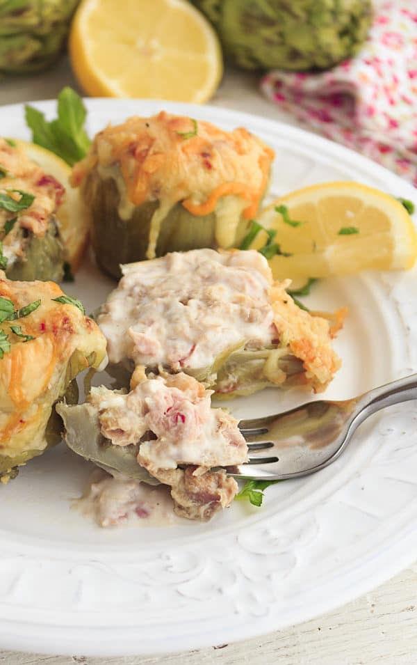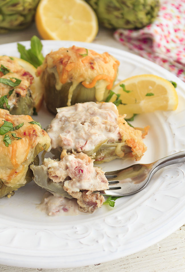 Otra opción es hacer estas alcachofas rellenas de atún. Llevan mayonesa en el relleno y se gratinan al horno con una capa de queso que le da un toque dorado y crujiente:
