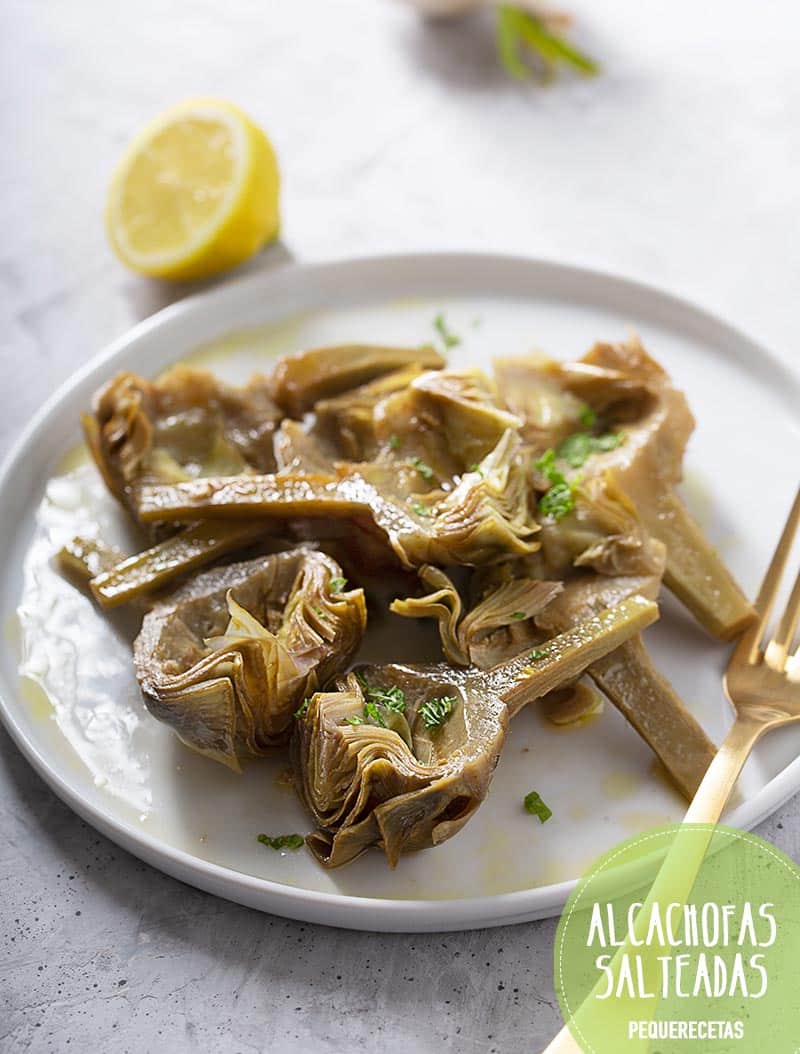 Preparación: Limpiamos las alcachofas como hemos visto al principio, o también podemos usar alcachofas congeladas. Las hervimos en abundante agua salada hasta que estén tiernas (si usas alcachofas de bote salta este paso). Escurrimos y cortamos por la mitad. Picamos los ajos y los salteamos en una sartén con un poco de aceite a fuego suave, cuando comienzan a dorarse los retiramos de la sartén y los reservamos en un cuenco. En la misma sartén con el aceite que quedó de los ajos salteamos las alcachofas durante 3 o 4 minutos. En el cuenco de los ajos añadimos el perejil picado, un poco de pimienta y un buen chorro de aceite de oliva. Retiramos las alcachofas de la sartén y aliñamos con el ajo y perejil.