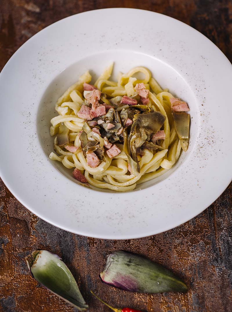 Ingredientes (4 personas): 320 g de pasta; 150 g de bacon; ½ vasito de vino blanco; 500 g de alcachofas; 30 g de queso parmesano rallado; aceite de oliva virgen extra; sal y pimienta