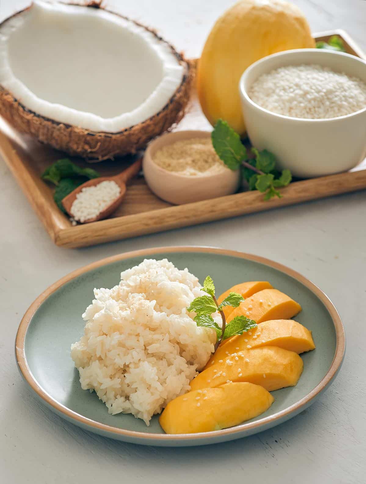 Se cocina el arroz glutinoso (lo encuentras en tiendas de productos asiáticos) al vapor y se reserva. Luego mezcla leche de coco con azúcar de palma o moreno (1/2 cucharada cada 100 ml de leche) y una pizca de sal, y se lleva al fuego hasta que hierva. Vamos mojando y mezclando el arroz con la leche endulzada, removiendo con delicadeza. Dejamos enfriar y servimos con mango en trozos y semillas de sésamo.