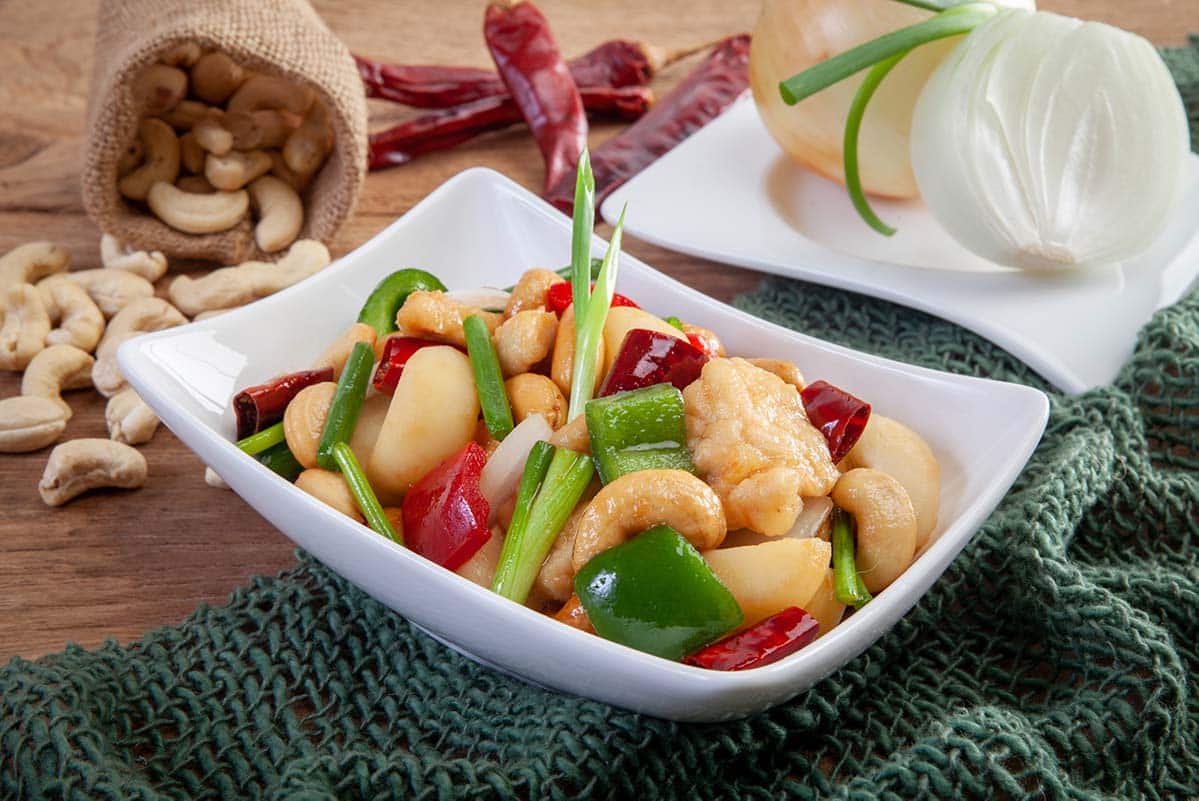 Aunque el pollo con anacardos es en origen una receta china, en Tailandia se ha adaptado a los gustos locales y es una receta hoy en día muy popular. El pollo se reboza y se fríe para que se mantenga crujiente por fuera y jugoso por dentro. Lo ideal es utilizar anacardos crudos, pero si no los conseguís también se pueden usar los que se venden ya fritos y salados. Todo se acompaña con una salsa realizada con una mezcla de salsa de soja, salsa de ostras, azúcar y pasta de chili.