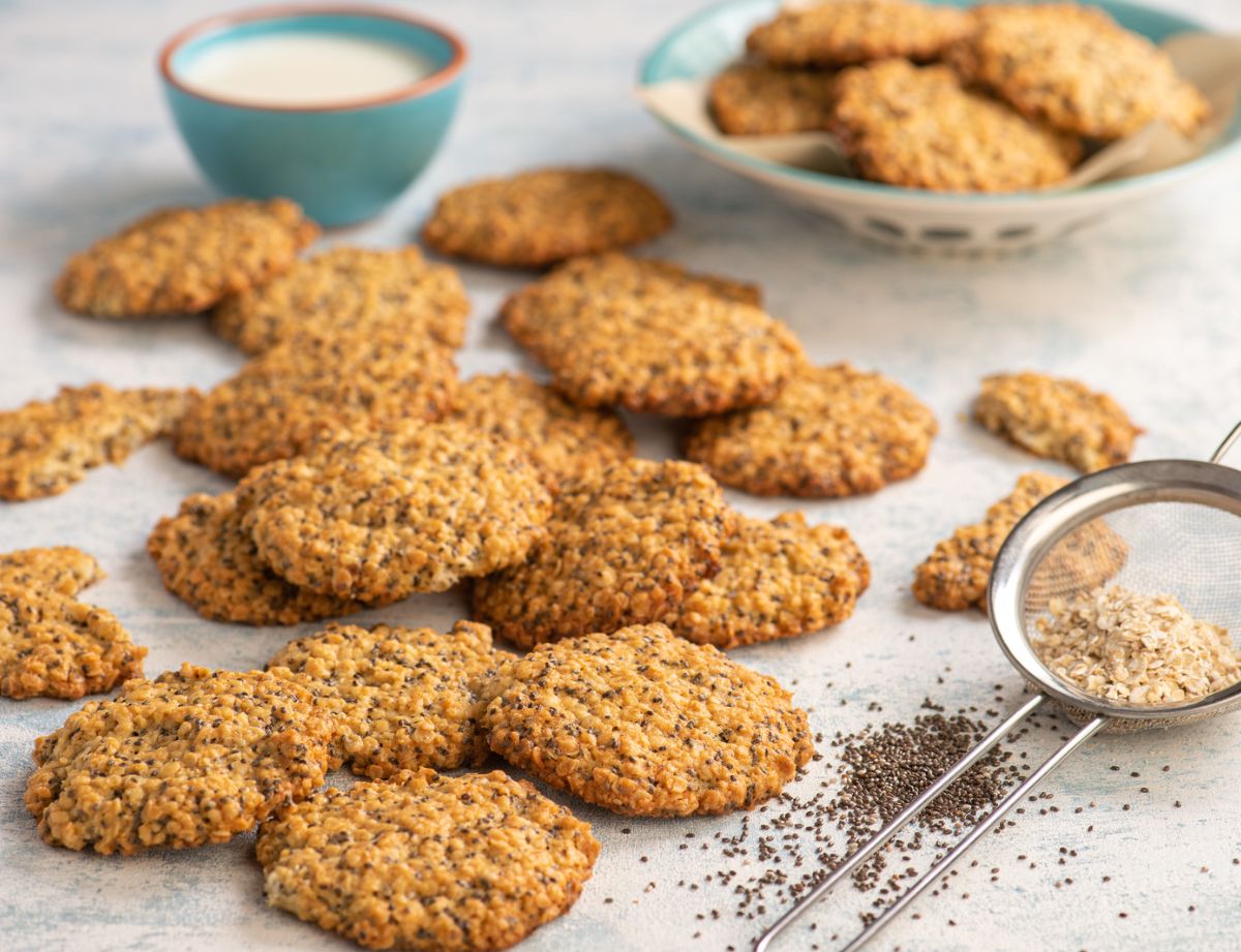 Preparación: En un recipiente, mezcla las semillas de chía con 4 cucharadas de agua y déjalas reposar hasta que se forme un gel. En otro recipiente, combina la avena en hojuelas, la harina de trigo integral, el azúcar de coco, el aceite de coco derretido, la leche vegetal, la esencia de vainilla, el bicarbonato de sodio y la sal. Agrega el gel de chía y mezcla bien todos los ingredientes hasta obtener una masa homogénea. Forma pequeñas galletas con la masa y colócalas en una bandeja para hornear previamente engrasada o cubierta con papel encerado. Hornea las galletas a 180 °C durante aproximadamente 15-20 minutos, o hasta que estén doradas. Deja enfriar antes de disfrutarlas.