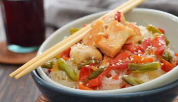 Esta receta de fideos de arroz con pollo y verduras está deliciosa y la tendrás lista en pocos minutos. La deliciosa combinación de fideos de arroz con pimientos, cebolla y pollo nos permiten disfrutar de un completo y delicioso plato de fideos chinos con todo el sabor de la cocina oriental.