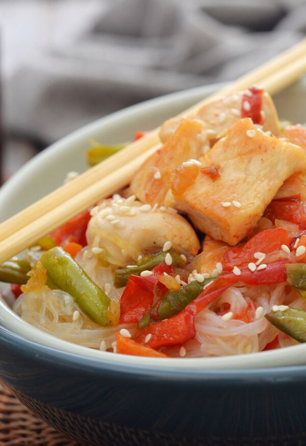 Ingredientes: 200 g de fideos de arroz, 1 pimiento rojo, 1 pimiento verde, 1 cebolla, 300 g de pechuga de pollo cortada en cubitos, 2 cucharadas de sésamo tostado, aceite de oliva, 2 cucharadas de salsa de soja sin gluten, sal y pimienta al gusto.