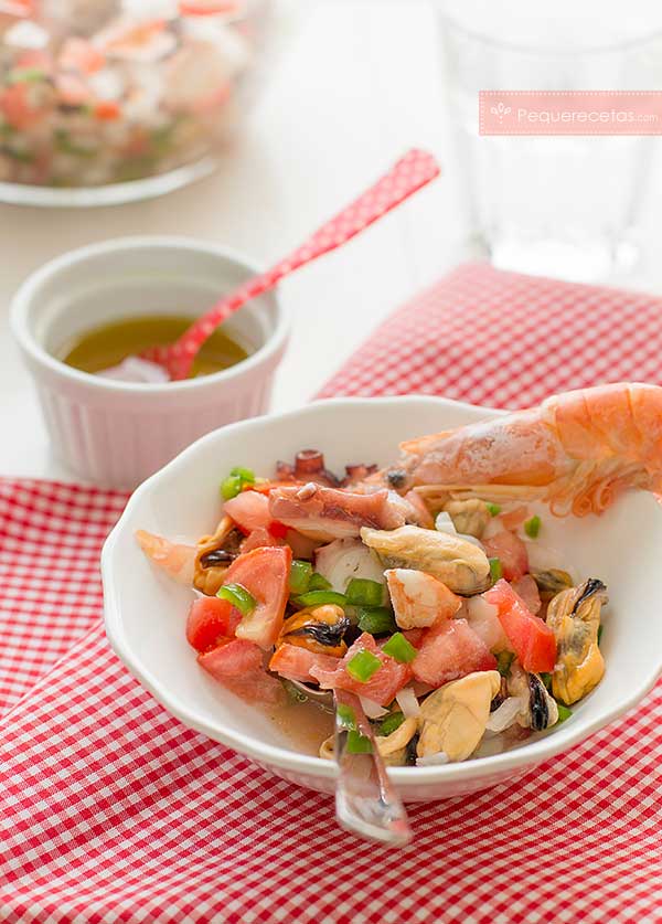 El salpicón de marisco habitualmente se prepara con pulpo cocido, mejillones, gambas y verduras. Es una receta ligera y muy veraniega: