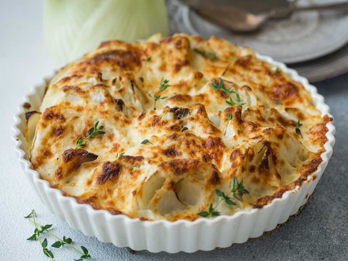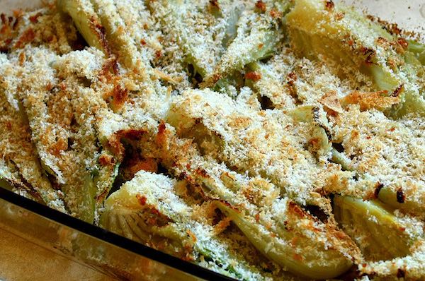 Ingredientes: 4 hinojos; 4 cebollas; 2 cucharadas de pan rallado; 30 g de mantequilla; sal; pimienta; 200 g de salsa bechamel; 30 g de queso gruyere