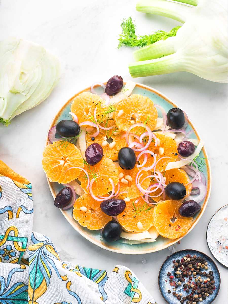En Italia el hinojo es bastante común y en Sicilia esta ensalada de hinojo y naranja es muy popular, en algunos casos se les puede añadir también aceitunas negras.