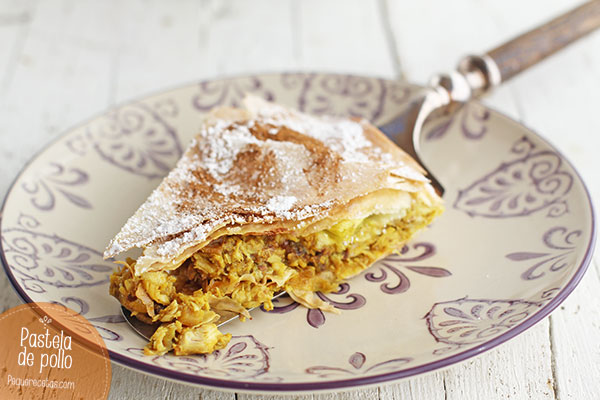 La pastela moruna, también conocida como bastela o bisteeya, es un plato tradicional de la cocina marroquí. Se trata de un pastel salado hecho con capas de masa filo rellenas de carne de pollo (o de paloma pero eso lo dejamos para alguna visita a Marruecos), frutos secos y una mezcla de especias. Se sirve espolvoreado con azúcar glas y canela, por lo que su sabor tiene un toque dulce.