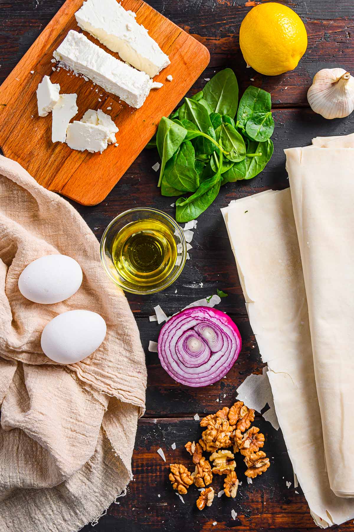 Ingredientes: 1 paquete de masa filo; 1 kg de espinacas frescas; 200 g de queso feta; 50 g de nueces; 1 diente de ajo; 1 cebolla morada pequeña; 2 huevos; aceite de oliva virgen extra; pimienta negra