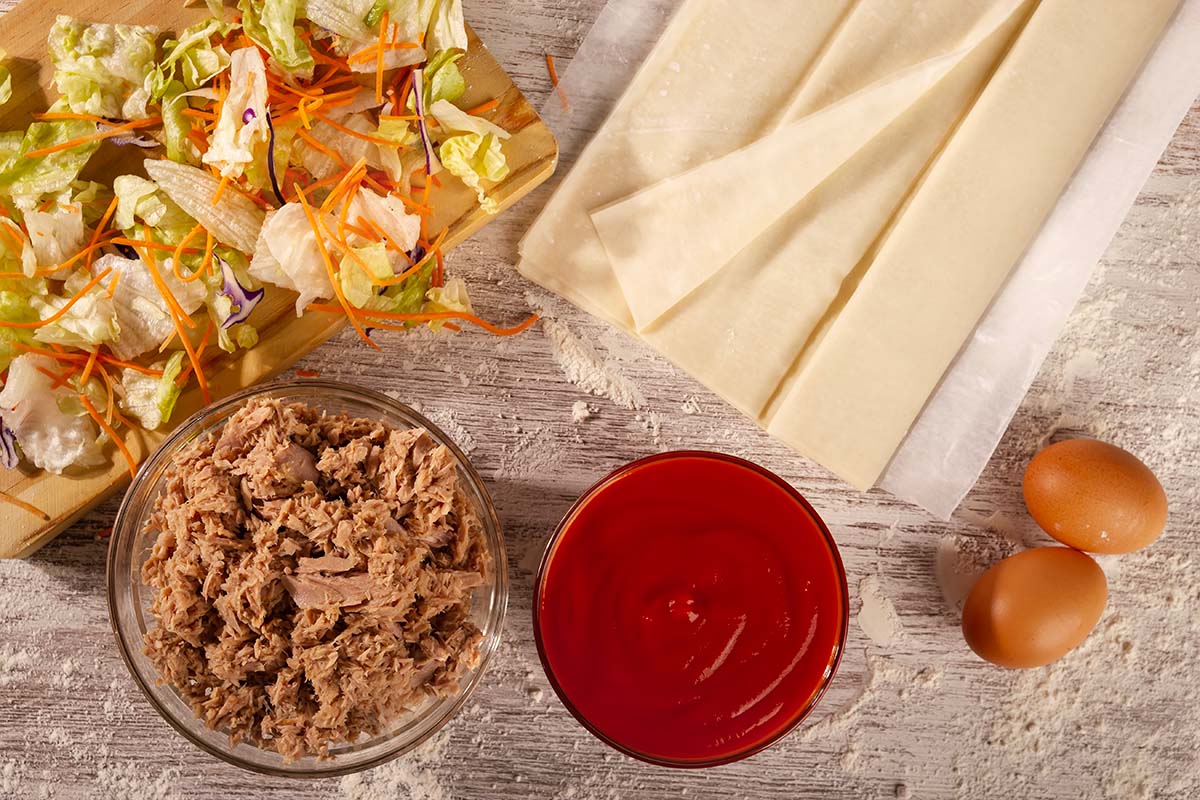 Rollitos de pasta filo rellenos de atún con tomate