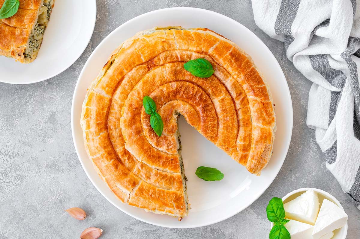 La spanakopita es una especie de empanada tradicional de la cocina griega, cuyo ingrediente principal es la espinaca y el queso feta. Nosotros lo hemos hecho con esta forma a espiral pero también puedes darle la tradicional forma de empanada.