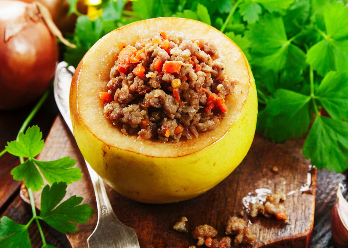- Rellena los membrillos con la mezcla de carne picada, presionando suavemente para que quepa la mayor cantidad posible.