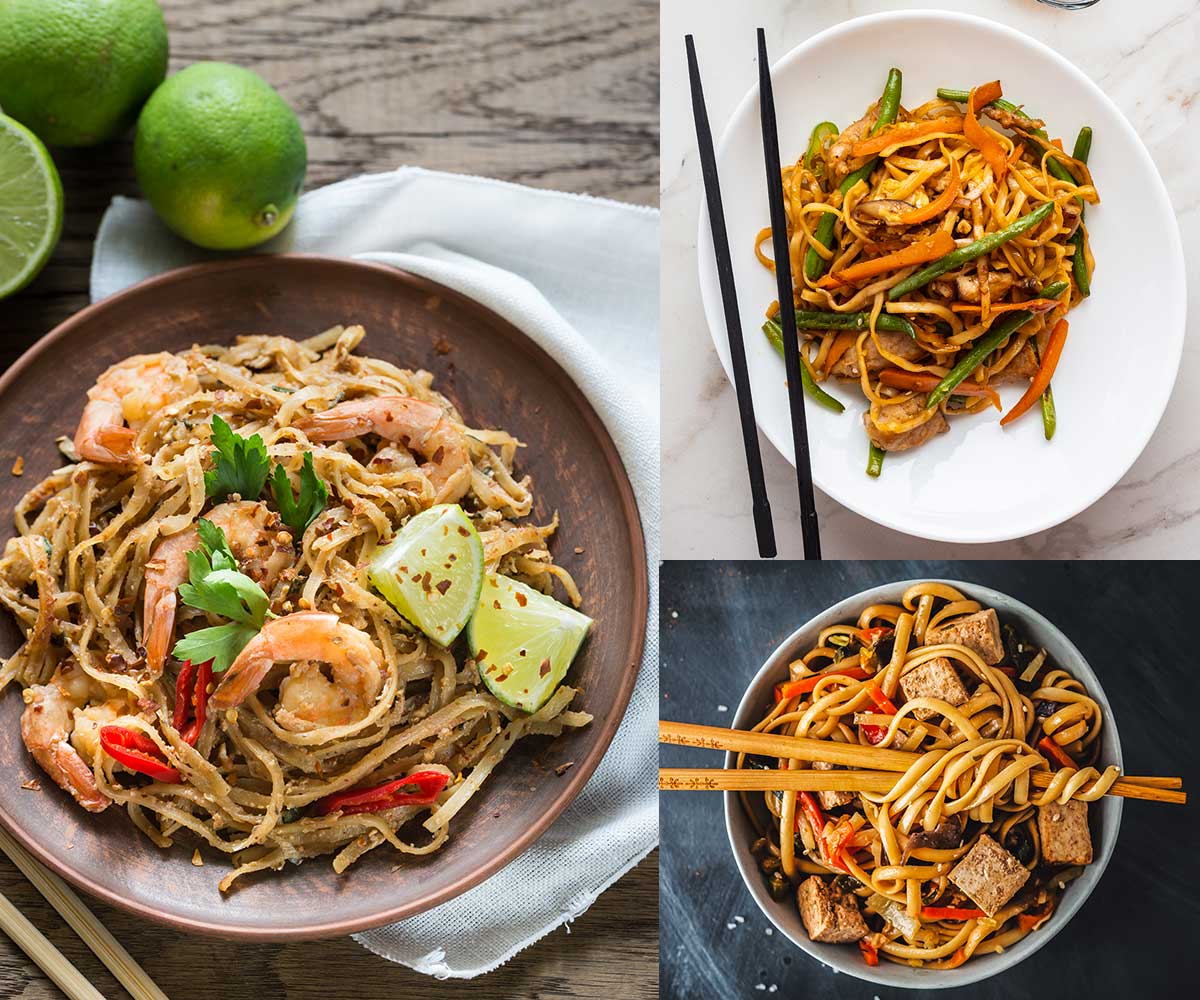 Los noodles pueden tener también diferentes formas: los udon son de trigo, y son largos y gruesos; los shahe fen de arroz son típicos de la comida cantonesa y son algo gruesos, al contrario de los que se usan para el pad thai tailandés, que son de arroz pero más finos.