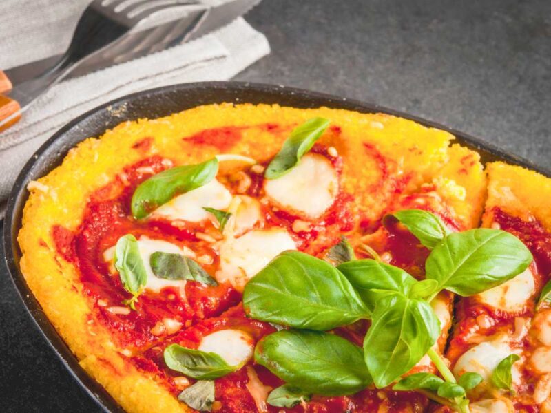 Preparación: Cocinamos la polenta, la extendemos en una bandeja y dejamos enfriar. Cubrimos con salsa de tomate, queso y otros ingredientes. Horneamos a 200 °C durante 15 minutos.