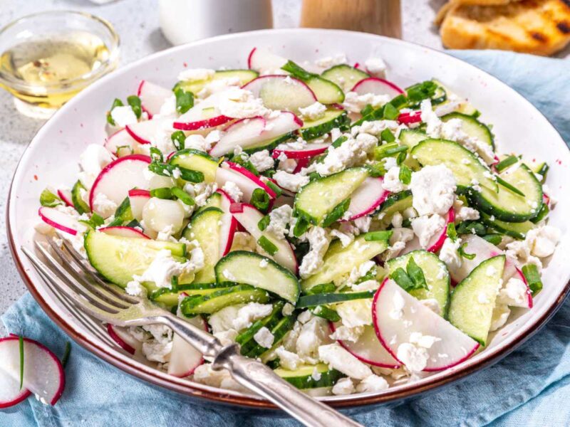Preparación: Lava bien el pepino y los rábanos, y córtalos en rodajas finas. En un bol, mezcla el queso cottage con el cebollino picado, el aceite de oliva, el jugo de limón, la sal y la pimienta. Agrega el pepino y los rábanos, removiendo suavemente para que se impregnen de la mezcla. Sirve frío y, si quieres un extra de textura, espolvorea unas semillas de sésamo o chía por encima.