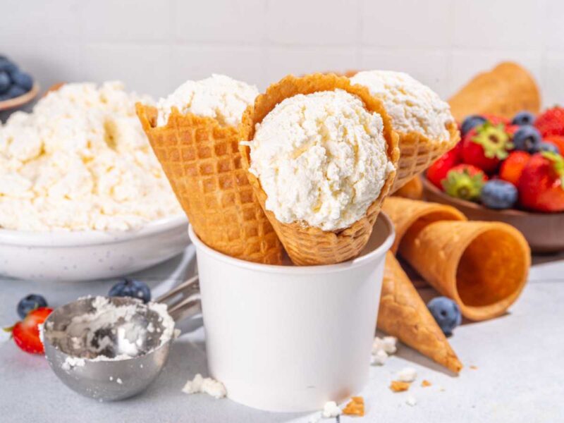 Preparación: En una batidora o procesador de alimentos, mezcla el queso cottage, el yogur, la leche, la miel y la esencia de vainilla hasta obtener una crema suave y homogénea. Vierte la mezcla en un recipiente apto para congelador y congela durante 3-4 horas, removiendo cada 30-40 minutos con un tenedor para evitar la formación de cristales de hielo. Cuando tenga la consistencia adecuada, sírvelo en boles o conos y disfruta.