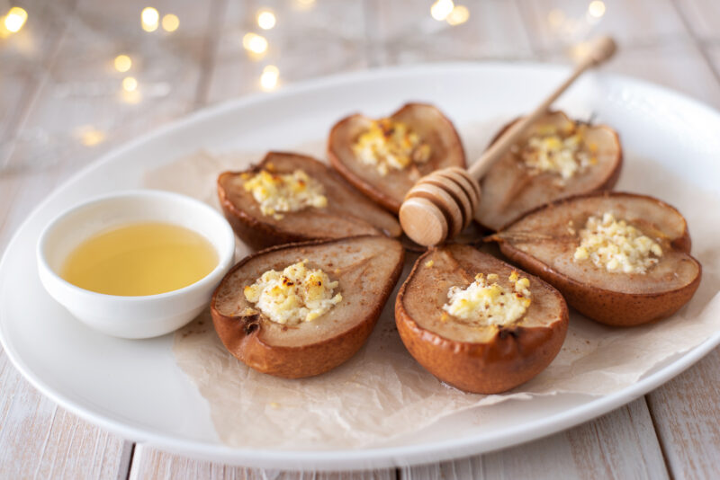 Ingredientes: Peras maduras pero firmes (3 unidades); queso cottage (100 g); miel (1 cucharada); canela en polvo (½ cucharadita); nueces picadas (1 cucharada); esencia de vainilla (½ cucharadita); jugo de limón (1 cucharadita).