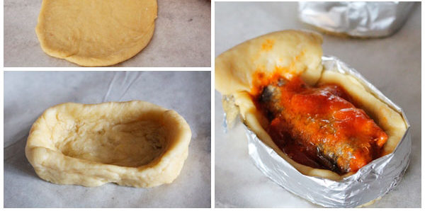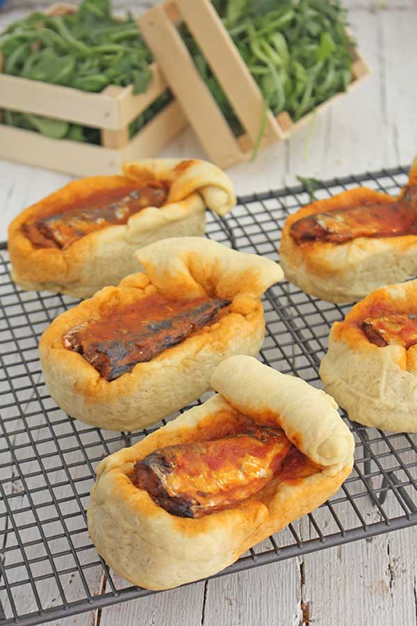 Ingredientes: 500 g de harina de fuerza, 180 ml de leche templada, 25 g de levadura fresca de panadería, 80 ml de aceite de oliva virgen extra,; 1 cucharadita de sal; 3 latas de sardinas en tomate