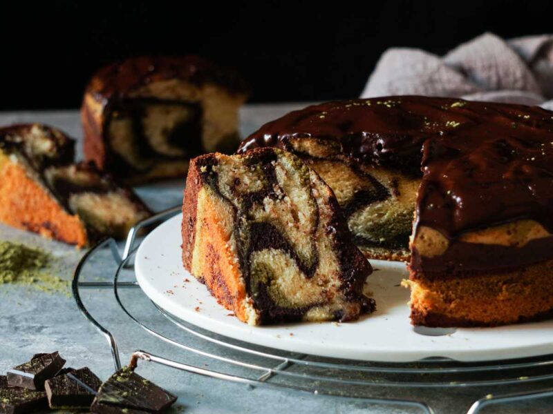Preparación: Precalienta el horno a 180 °C y engrasa un molde para bizcocho. Bate la mantequilla con el azúcar hasta obtener una mezcla cremosa y luego agrega los huevos uno a uno. Tamiza la harina, el polvo de hornear y la sal, y mezcla con la leche. Divide la masa en dos partes, a una agrégale el té matcha y a la otra el chocolate derretido. Coloca las masas alternadas en el molde y usa un palillo para crear el efecto marmoleado. Hornea durante 40-50 minutos o hasta que un palillo salga limpio. Deja enfriar antes de desmoldar.