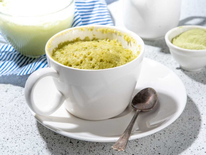 Preparación: Mezcla los ingredientes secos (harina, azúcar, matcha y polvo de hornear) directamente en una taza apta para microondas. Añade el huevo, la leche y el aceite, remueve bien hasta que no queden grumos y cocina en el microondas a máxima potencia durante 1 minuto y medio. ¡Deja que se enfríe un poco y disfruta tu mug cake directo de la taza!