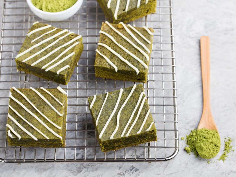 Preparación: Derrite el chocolate blanco junto con la mantequilla al baño maría o en el microondas. Deja que se enfríe un poco y añade los huevos uno a uno, mezclando bien. Incorpora el azúcar, la harina, el matcha y la sal hasta obtener una masa homogénea. Vierte la mezcla en un molde rectangular engrasado y hornea a 180 °C durante 20-25 minutos. Déjalo enfriar antes de cortarlo en porciones cuadradas.