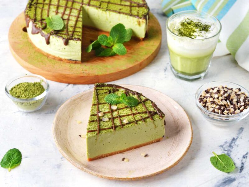 Preparación: Tritura las galletas y mézclalas con la mantequilla para formar la base del cheesecake. Presiónala en un molde desmontable y refrigera. Bate el queso crema con el azúcar, añade la nata montada y el matcha previamente disuelto en un poco de agua tibia. Hidrata la gelatina y disuélvela, luego incorpórala a la mezcla. Vierte sobre la base de galleta y refrigera al menos 4 horas. Decora con polvo de matcha y chocolate derretido antes de servir.
