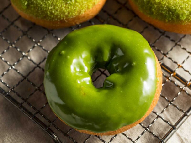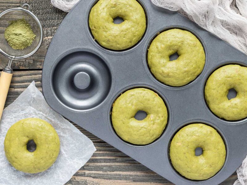 Preparación: En un bol, mezcla la harina, el azúcar, el matcha, el polvo de hornear y la sal. Aparte, combina los huevos, la leche y la mantequilla derretida, y luego incorpora los ingredientes secos. Llena los moldes para donuts (engrasados previamente) hasta la mitad y hornea a 180 °C durante 12-15 minutos o hasta que estén dorados.
