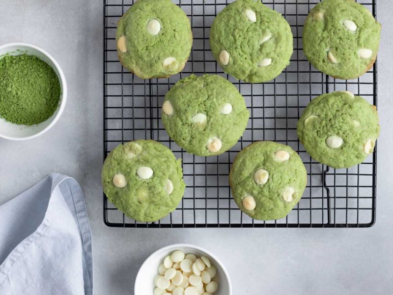 Preparación: En un bol, bate la mantequilla con los azúcares hasta que la mezcla esté cremosa. Añade el huevo y bate nuevamente. Aparte, mezcla la harina, el té matcha, el bicarbonato y la sal, y tamiza los ingredientes secos sobre la mezcla húmeda. Incorpóralos hasta formar una masa homogénea. Agrega las chispas de chocolate blanco y mezcla bien. Forma bolitas de masa y colócalas en una bandeja para horno forrada con papel, dejando espacio entre ellas. Hornea a 180 °C durante 10-12 minutos, hasta que los bordes estén ligeramente dorados. Deja enfriar antes de moverlas para que no se rompan.