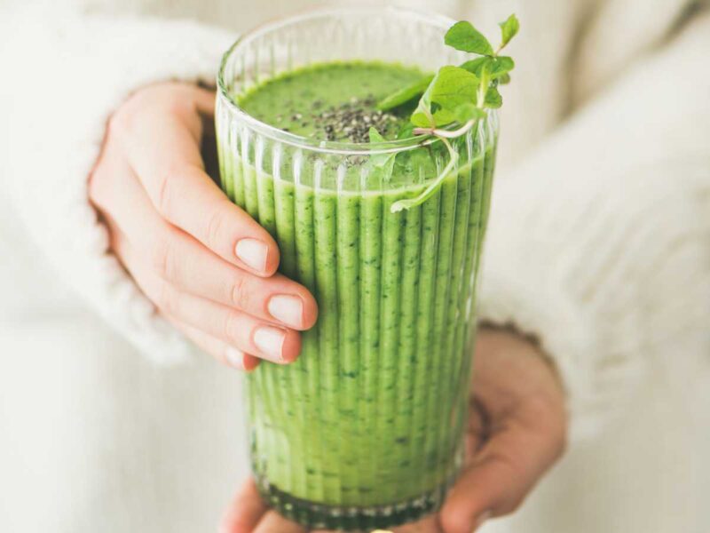 Ingredientes: 1 plátano maduro; 1 taza de espinacas frescas; 200 ml de leche de almendra (o la que prefieras); 5 g de té matcha en polvo; 1 cucharadita de semillas de chía; 5-6 cubos de hielo; miel o endulzante al gusto (opcional).