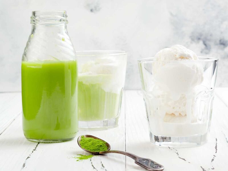 Ingredientes: 10 g de té matcha en polvo; 100 ml de agua caliente; 2-3 bolas de helado de vainilla; azúcar o endulzante al gusto (opcional).