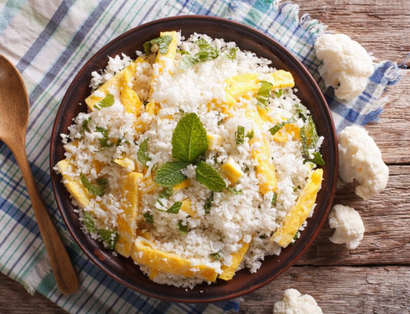 El arroz de coliflor es otra de las texturas que se consiguen con la versátil coliflor. Esto nos permite preparar desde ensaladas a un delicioso arroz de coliflor tres delicias: