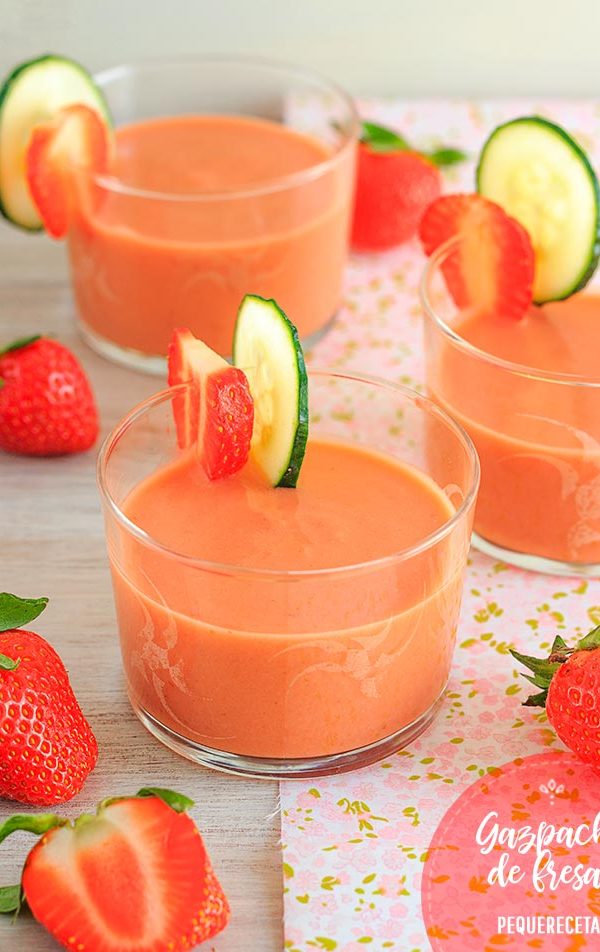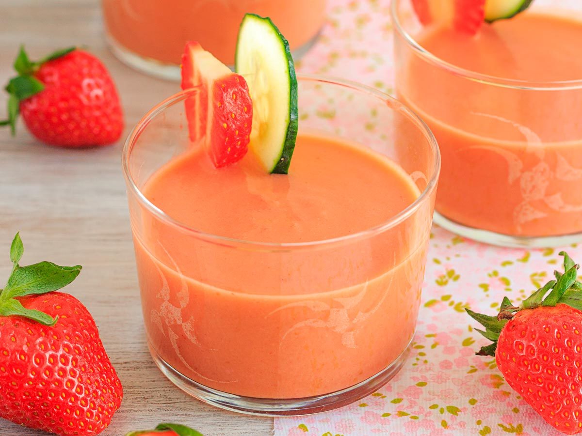 Este gazpacho de fresas es una deliciosa fusión de dulce y ácido, donde las fresas frescas juegan el papel principal en una interpretación audaz y colorida del gazpacho tradicional.