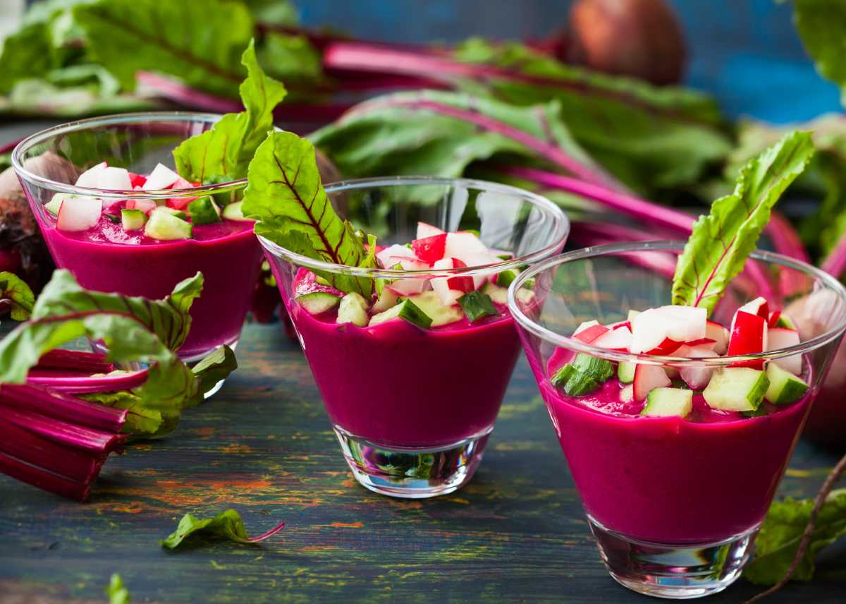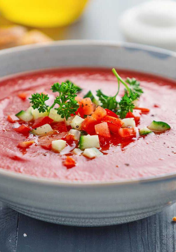 Con su llamativo color rojo vibrante, el gazpacho de remolacha es tanto un placer visual como gustativo. La remolacha añade una profundidad de sabor y un dulzor sutil que se complementa con la acidez del tomate y el vinagre.