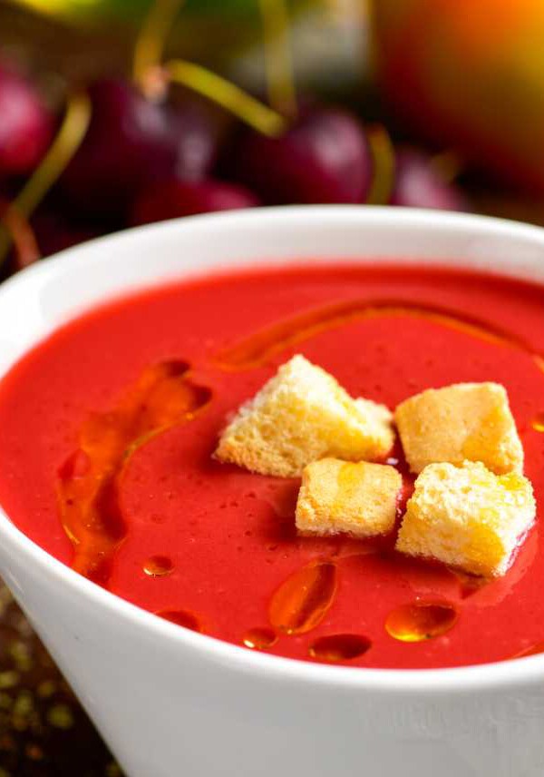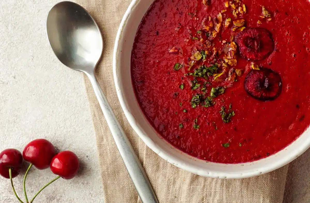 El gazpacho de cerezas es una variante deliciosa y visualmente impactante del tradicional gazpacho. Incorporando cerezas frescas a la mezcla clásica de tomates y vegetales, este gazpacho ofrece un equilibrio perfecto entre dulce y ácido. Su vibrante color rojo y la textura sedosa hacen de este plato una elección original para sorprender a todos: